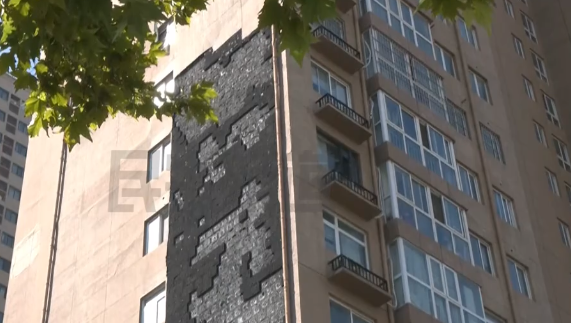 高层墙面粉饰物、松动的瓷砖及窗户玻璃碎片正